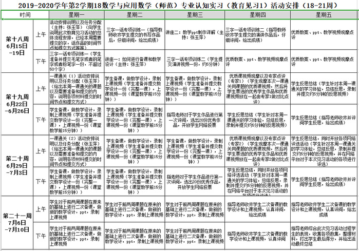 受教育研習(xí)成功經(jīng)驗的鼓舞,數(shù)學(xué)與統(tǒng)計系再接再厲,在教務(wù)處和人工智能與大數(shù)據(jù)學(xué)院領(lǐng)導(dǎo)的關(guān)心和支持下,在數(shù)學(xué)與統(tǒng)計系王磊主任的帶領(lǐng)下,秉承“學(xué)生中心、產(chǎn)出導(dǎo)向”的原則,經(jīng)過反復(fù)調(diào)研,積極籌備,為2018級數(shù)學(xué)專業(yè)74名師范生量身制定了為其四周的線上教育見習(xí)實訓(xùn)(6月15日-7月10日)。此次活動形式創(chuàng)新、內(nèi)容豐富,包括“線上書寫比賽”“線上演講比賽”“一周一課、課課通關(guān)”“專家課例點評”“教研見習(xí)反思”“第十一屆安徽省師范生技能大賽十強集訓(xùn)”等系列活動。在教育見習(xí)過程中,邀請了合肥一中劉娟、胡媛媛,合肥六中徐小松,合肥一六八中學(xué)黃小娟、張玉萍等知名中學(xué)的5位一線教師和合肥市教育局的許曉天、張永超等數(shù)學(xué)教研員。他們充分參與了學(xué)生教學(xué)視頻的觀摩與評改,專業(yè)的線上教學(xué)評價講座等活動,充分踐行了《中學(xué)教育專業(yè)認證》中強調(diào)的“高校,地方政府,中學(xué)”三位一體、協(xié)同育人的新形式。