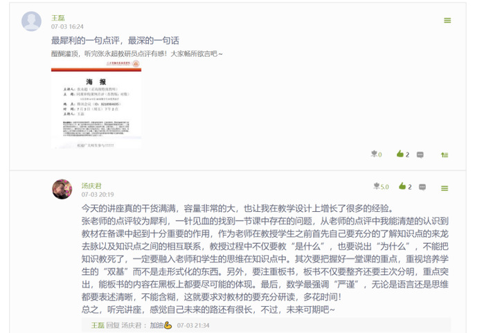 線上見習(xí)效果好不好,還得學(xué)生說了算。在7月3日合肥市教育局正高級特級教師張永超老師持續(xù)時長3個小時的關(guān)于“對數(shù)”的課題點評講座后,18數(shù)學(xué)趙強同學(xué)在學(xué)習(xí)通平臺寫下了長達1600字的感言:“首先真的很感謝有這樣一個與名師線上對面的機會,張永超老師在昨日花費了近三小時的寶貴時間給我們帶來的講座,這場探討交流課不得不用精彩去形容,如果再加一個字,那就是很精彩!聽完張老師就對數(shù)概念這堂課從而深入的數(shù)學(xué)思想、數(shù)學(xué)方法和數(shù)學(xué)精神都頗具特色,他用他獨特的視角與方式……”。
