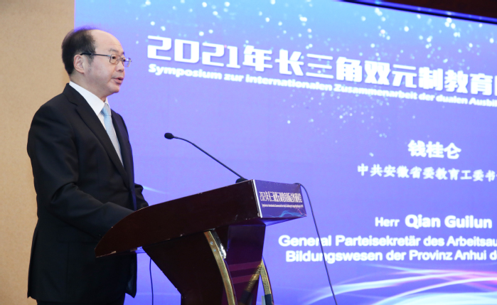 Qian Guilun, Sekret?r des Ausschusses für Bildung der Provinz Anhui der Kommunistischen Partei Chinas, wies in seiner Rede darauf hin, dass das Duale System als Lehrmodell der Zusammenarbeit zwischen Hochschulen und Unternehmen und der Integration von Produktion und Bildung gilt, wessen Umsetzung mit der Beteiligung der Unternehmen zusammenh?ngt. Unternehmen f?rdern die Reform und Innovation von fundierten Ausbildungsprogrammen, Lehrplansystemen, Lehrinhalten und Lehrmethoden und beteiligen sich an der qualitativ hochwertigen Ausbildung von angewandten Talenten, was eine positive Rolle bei der Ausbildung von angewandten technischen Talenten spielt, die den Bedürfnissen von Unternehmen und Branchen entsprechen. Er drückte die Hoffnung aus, dass beide Seiten gemeinsame Anstrengungen unternehmen werden, um die Integration von Produktion und Bildung, die Zusammenarbeit zwischen Hochschulen und Unternehmen zu f?rdern, das duale System in Anhui, im Jangtse-Delta und in China Wurzeln zu schlagen und sich um die Ausbildung hochwertiger angewandter technischer F?higkeiten zu bemühen, um den Gesamtaufbau eines modernen sozialistischen Landes zu unterstützen.