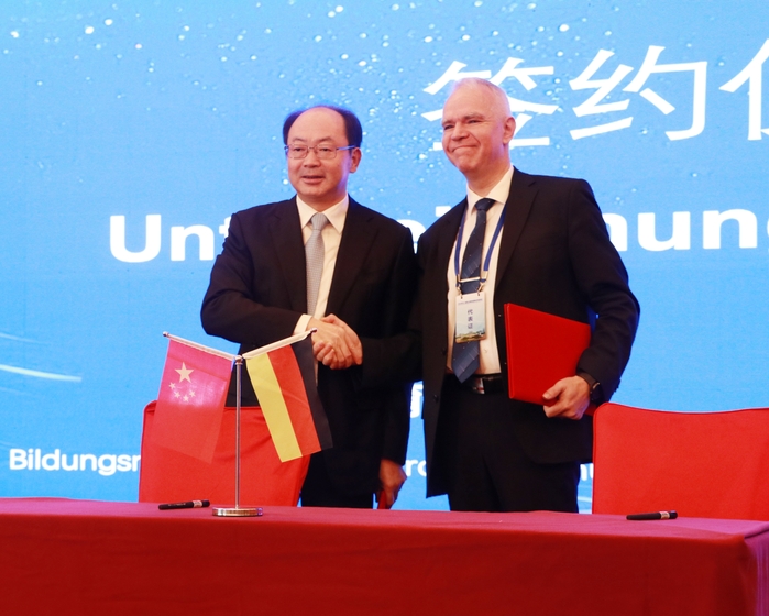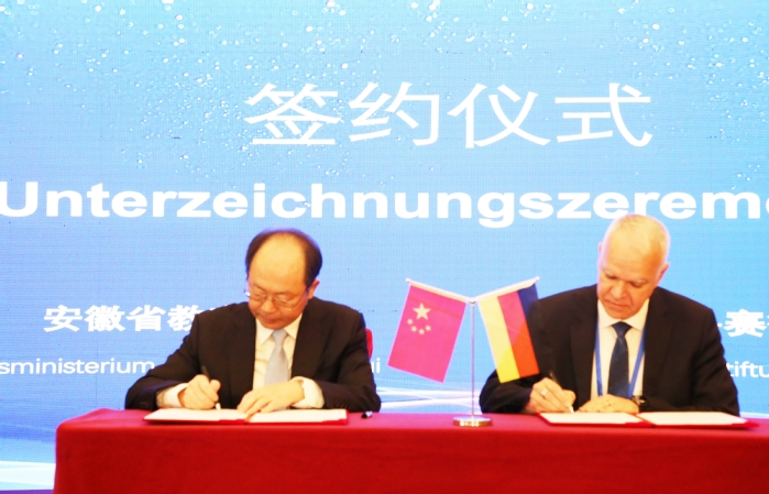Die Unterzeichnungszeremonie fand anschlie?end statt. Qian Guilun und Georg Stadler unterzeichneten als Vertreter beider Seiten eine Kooperationsvereinbarung. In Zukunft werden beide Seiten bei den Ausbildungen über die Themen Forschung über das Lehrprogramm, F?rderung der Lehr- und Praxisf?higkeit von Lehrkr?ften und Einführung praxisorientierter Lehrkonzepte, dem Aufbau von Ausbildungszentren und dem Aufbau von Lehrqualit?tsmanagementsystemen zusammenarbeiten, um den Austausch und die Freundschaft zwischen China und Deutschland im Bildungsbereich weiter zu st?rken und die Entwicklung der beruflichen Bildung in der Provinz Anhui zu f?rdern.