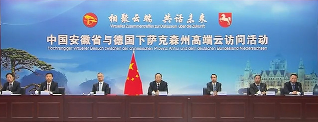 Am 16. Juli hielten die Provinz Anhui und das deutsche Bundesland Niedersachsen eine Videokonferenz zum Thema Virtuelles Zusammentreffen zur Diskussion über die Zukunft — Hochrangiger Virtueller Besuch zwischen der chinesischen Provinz Anhui und dem deutschen Bundesland Niedersachsen ab. An der Veranstaltung nahmen Li Jinbin, Sekret?r des Komitees der Kommunistischen Partei der Provinz Anhui, Wang Qingxian, Gouverneur der Volksregierung der Provinz Anhui, Stephan Weil, Nieders?chsischer Ministerpr?sident, Zhang Xi, Vizegouverneur der Volksregierung der Provinz Anhui, Du Xiaohui, chinesischer Generalkonsul in Hamburg, Thomas Triller, amtierender deutscher Generalkonsul in Shanghai, und Wu Chunmei, Pr?sidentin der Universit?t Hefei teil.