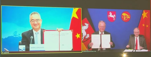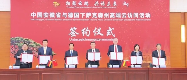 Wang Qingxian und Weil unterzeichneten online die Absichtserkl?rung zwischen der Volksregierung der Provinz Anhui der Volksrepublik China und der nieders?chsischen Landesregierung der Bundesrepublik Deutschland über die weitere Vertiefung der freundschaftlichen Beziehungen zwischen Anhui und Niedersachsen und tauschten Geschenke aus.