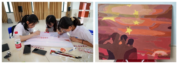 手繪我的祖國。習近平總書記在慶祝中國共產黨成立一百周年大會上對青年提出希望:“未來屬于青年,希望寄予青年”,臺下無數青年以“請黨放心,強國有我”與之回應,其聲久久回蕩在天安門廣場之上,讓人熱血澎湃。五星紅旗冉冉飄起,志愿者們面向國旗,莊嚴肅穆,這就是當代青年心中祖國最美的樣子。實踐團隊的成員們紛紛將紅色顏料沁入筆尖,一筆一畫中包含著對祖國的美好祝愿。
