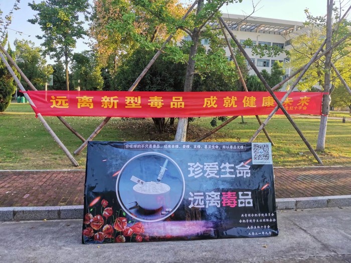 我校是合肥市禁毒高校聯盟成員校之一,此次禁毒宣傳教育活動依托我校大學生紅十字會組織開展,在一期和二期校園內分別開設宣傳點,擺放禁毒宣傳教育海報和橫幅。紅十字會的志愿者們通過現場講解毒品危害常識、舉辦毒品危害知識小問答、發放合肥市禁毒辦統一制作的宣傳小禮品等形式開展宣傳教育活動,引導同學們關注國家禁毒的官方微信公眾號,呼吁同學們提高毒品危害意識,自覺遠離毒品。宣傳期間,我校學生參與度高,主動了解有關毒品危害的知識,積極轉發大學生紅十字會官方平臺的禁毒宣傳文案,活動現場,很多同學在禁毒橫幅和宣傳展板上簽名。
