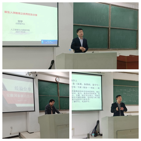 科大國禎暨合肥城市云數據中心股份有限公司技術總監、2001級計算機科學與技術專業畢業生劉宇深情回顧了在母校求學的難忘經歷以及畢業十多年以來的工作歷程。他表示,在工作中必須始終有居安思危的意識,不放松警惕,在順境中勇往直前,在逆境中保持自我。安徽國泰新點軟件股份有限公司公共研發部工程師、2015級軟件工程專業許海峰從大學生涯、求職經歷、工作經歷以及人生感悟四個方面為同學們做了分享。他強調,學好專業知識,這是求職成功的根本。他鼓勵同學們珍惜大學時光,認真學習專業知識,同時要保持積極樂觀的態度,決不能因為一兩次的失敗而懷疑自己。合肥一六八中學高三班主任、2006級數學與應用數學(師范)專業畢業生章春有著豐富的教學經驗和帶班經驗。“學乃教育之基礎,德乃教育之根源。”他從自身教學經驗出發,強調德育和美育要相結合,要教給學生研究數學問題的一般方法,培養他們研究問題的能力。