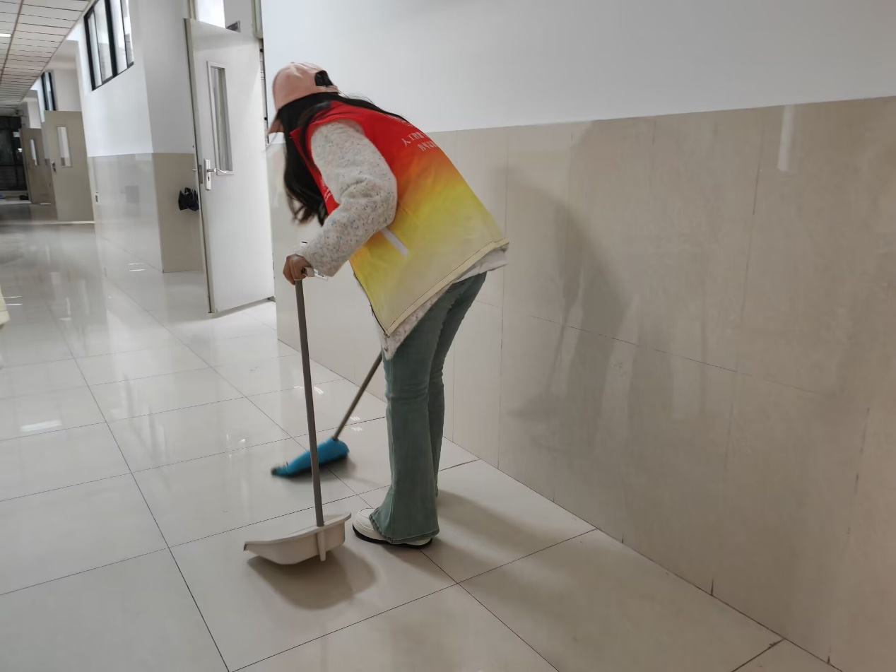 志愿者們手持掃把、拖把、清潔劑等工具,分工明確,有的負責用掃帚清掃地面,有的負責使用拖把拖地,還有的負責整理講桌。志愿者的行動迅速而有序,確保了教學樓的每一個角落都變得更加干凈明亮。