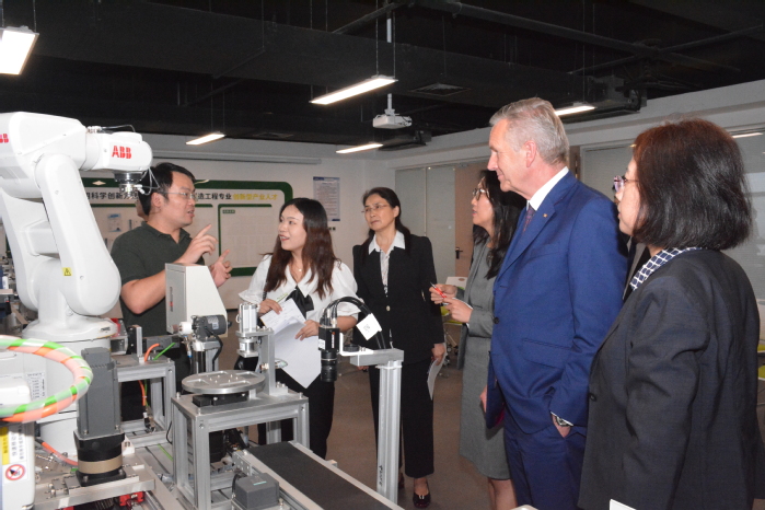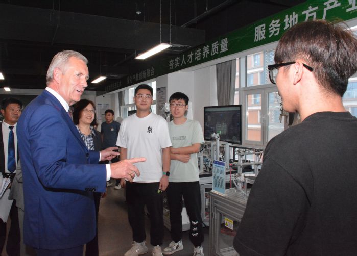 Herr Wulff und seine Delegation besuchten auch die Ausbildungsplattform des Volkswagen-Instituts und informierten sich über den Aufbau der F?cher, das modulare Curriculum, die praktische Ausbildung und den Unterricht im Labor für die Zustandsbewertung multimodaler Ger?te im Anwendungs- und Innovationszentrum für intelligente Fertigungssystem und im Anwendungszentrum für digitale Zwillingstechnologie und -technik. Er best?tigte die Positionierung der Universit?t Hefei als ?lokal, anwendungsorientiert und international“.