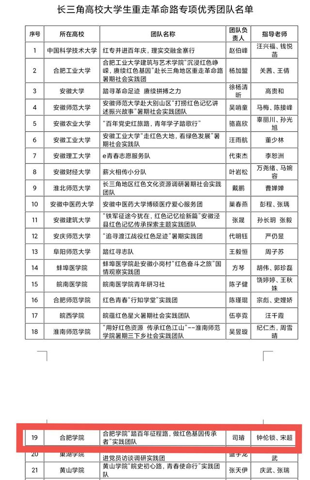 2021年暑假期間,她組建了“紅色基因傳承行”和“鄉村振興實踐團”分別前往在六安市和合肥市內紅色革命遺址進行調研,她在實踐中始終秉承著“走向社會、服務社會、鍛煉能力”的宗旨,多次深入調研地區周邊開展訪談交流等活動,切實了解群眾所思所想。實踐團隊共組織活動5場,參觀紅色遺址10處,路線總里程達到900公里。調研團隊發布各類稿件40余篇,其中包括六篇“中青校園”網站報道,一篇縣區網站(金寨群團)報道;同時在共青團安徽省委官方抖音號“青春安徽”和中青校園上各發布視頻1份,取得良好反響。她所在的團隊成功入圍2021年“全國百強戰隊”評選,并榮獲2021年全國大中專學生志愿者暑期“三下鄉”社會實踐“鏡頭中的三下鄉”優秀攝影團隊、長三角高校大學生重走革命路專項“最美日記”、省級優秀團隊,其中她她撰寫的調研報告(關于如何增長青年大學生“三氣”調研報告)獲得長三角高校大學生重走革命路專項優秀調研報告三等獎。