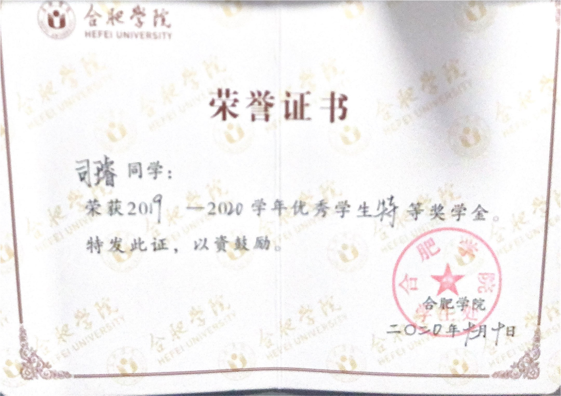 “好學近乎知”。司璿同學作為班級學習委員,在日常工作中積極發揮老師和同學之間的紐帶橋梁作用,主動幫助同學、協助老師完成日常學習工作,為人樂觀向上,學習刻苦,踏實負責,學習品質獲得老師同學的一致好評,并榮獲合肥學院優秀學生教學信息員稱號,群眾基礎扎實。學習中,她追求超越,一直以嚴格的標準要求自己。大一、大二綜合素質排名專業第一,曾連續兩年獲得國家勵志獎學金、合肥學院特等獎學金、三好學生等榮譽。積極參與學科競賽,曾獲第十七屆“挑戰杯”全國大學生課外學術科技作品競賽紅色專項活動安徽省省級三等獎兩項,“外研社·國才杯” 全國英語閱讀大賽校級初賽二等獎、寫作大賽校級初賽一等獎,目前是多項省級創新創業項目負責人。
