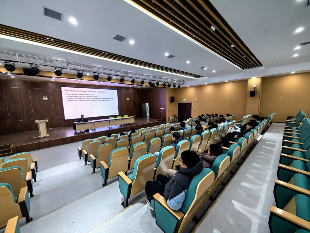 20231218日(周一)上午九點(diǎn)半,在合肥大學(xué)南艷湖校區(qū)55205報(bào)告廳,23電子信息碩士生部分成員參加了由合肥大學(xué)科研處、先進(jìn)制造工程學(xué)院主辦,美國(guó)加州大學(xué)Ye-Hwa Chen博士主講的題為“The Character of Control Theory ”的學(xué)術(shù)報(bào)告。Ye-Hwa Chen 博士詳細(xì)介紹了控制論的歷史,從工業(yè)革命時(shí)期詹姆斯·瓦特創(chuàng)造性地提出了一種反饋轉(zhuǎn)矩來(lái)平衡蒸汽機(jī)的旋轉(zhuǎn)變化。到演變?yōu)楣诺淇刂疲俸髞?lái)發(fā)展為現(xiàn)代控制和后現(xiàn)代控制。講述了目前有許多成熟的控制方法是由創(chuàng)造性的工程師開(kāi)發(fā)的,它們從最優(yōu)性、適應(yīng)性、魯棒性和智能化等方面解決了工業(yè)中的實(shí)際問(wèn)題。最后帶同學(xué)們回顧發(fā)展過(guò)程,解答了一個(gè)自然的問(wèn)題:這些控制論背后的共同特征是什么?
