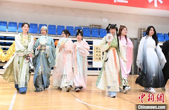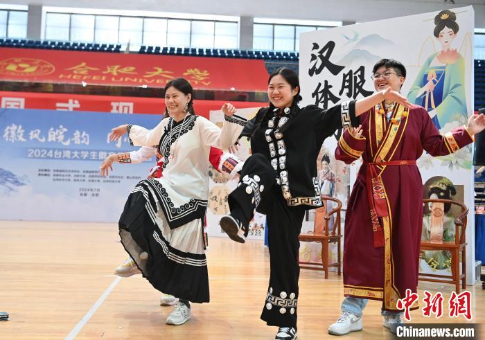 75日,在合肥大學(xué)南艷湖校區(qū),臺(tái)灣學(xué)生身穿民族服飾走秀。當(dāng)日,2024年皖臺(tái)青年交流活動(dòng)啟動(dòng)儀式暨臺(tái)灣大學(xué)生徽文化夏令營開營式在合肥舉行,來自臺(tái)灣的70余名青年師生走進(jìn)合肥大學(xué),體驗(yàn)傳統(tǒng)文化。