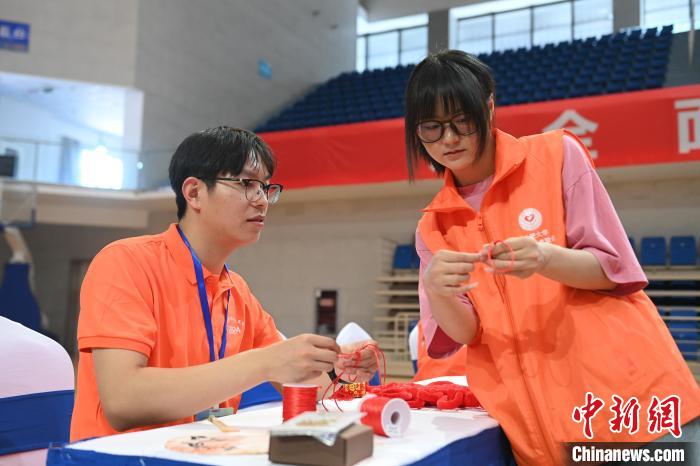 75日,在合肥大學(xué)南艷湖校區(qū),臺(tái)灣學(xué)生(左)在學(xué)習(xí)制作中國結(jié)。當(dāng)日,2024年皖臺(tái)青年交流活動(dòng)啟動(dòng)儀式暨臺(tái)灣大學(xué)生徽文化夏令營開營式在合肥舉行,來自臺(tái)灣的70名青年師生走進(jìn)合肥大學(xué),體驗(yàn)傳統(tǒng)文化。