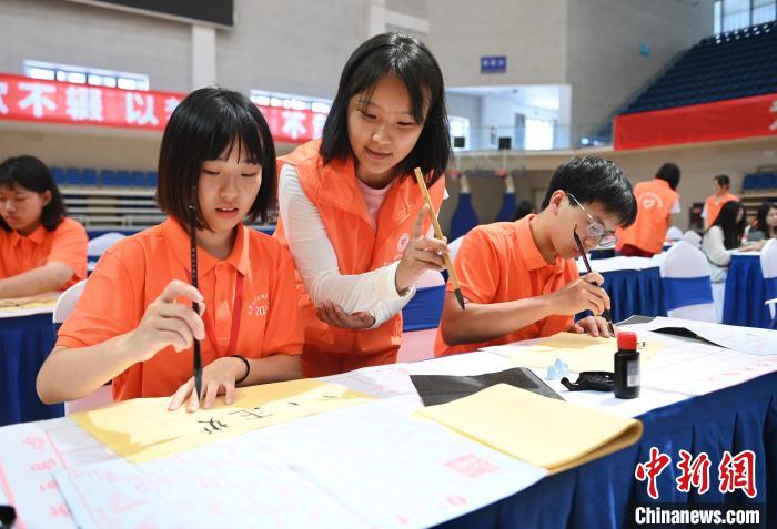 75日,在合肥大學(xué)南艷湖校區(qū),臺(tái)灣學(xué)生(左)在學(xué)習(xí)寫毛筆字。當(dāng)日,2024年皖臺(tái)青年交流活動(dòng)啟動(dòng)儀式暨臺(tái)灣大學(xué)生徽文化夏令營開營式在合肥舉行,來自臺(tái)灣的70余名青年師生走進(jìn)合肥大學(xué),體驗(yàn)傳統(tǒng)文化。