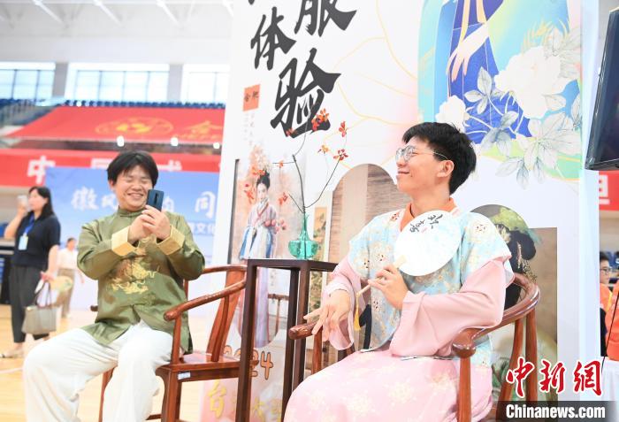 75日,在合肥大學(xué)南艷湖校區(qū),臺(tái)灣學(xué)生身穿民族服飾拍照打卡。當(dāng)日,2024年皖臺(tái)青年交流活動(dòng)啟動(dòng)儀式暨臺(tái)灣大學(xué)生徽文化夏令營開營式在合肥舉行,來自臺(tái)灣的70余名青年師生走進(jìn)合肥大學(xué),體驗(yàn)傳統(tǒng)文化。