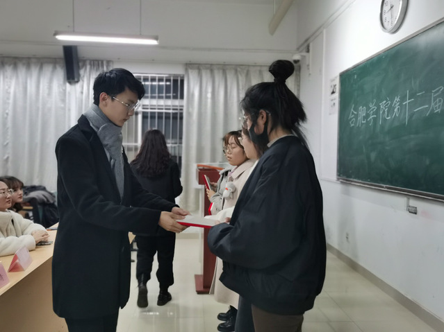 2020年11月28日,合肥學(xué)院第十六屆校園文化藝術(shù)節(jié)之自薦書大賽頒獎儀式于我校一區(qū)博學(xué)樓B座303教室順利舉。出席頒獎儀式的嘉賓經(jīng)濟(jì)與管理學(xué)院第二屆學(xué)生會主席團(tuán)全體成員及比賽獲獎?wù)邆儯瑑x式權(quán)益部部長羅一主持。