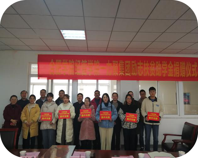 會議伊始,陳江華院長首先向來訪企業方人員表示熱烈歡迎,介紹經管學院總體情況和發展前景,高度贊揚力聚集團對我院貧困學子的捐助行為。陳邦勤書記向與會成員介紹了力聚集團的發展歷程,表明了此次捐助的目的,期待雙方在人才培養等多方面進一步展開合作。接著,劉金平主任介紹了合肥學院中德合作基金會的發展歷程以及所取得成就,姚國強總監詳細說明了此次捐助的來龍去脈,表達了希望雙方共同進步的愿景表示隨時歡迎我校學生加入力聚集團。學生代表力聚集團的捐贈及合肥學院的培養表達了真摯的感謝,表示一定不辜負校企雙方的希冀,圓滿完成自己的學業。最后,校企雙方簽訂實習基地協議及捐贈協議;校方代表楊學春、劉金平、張永軍與企業代表陳邦勤、姚國強、周龍海一道為受助的六位同學頒發助學金,然后校企雙方進行了合影留念。