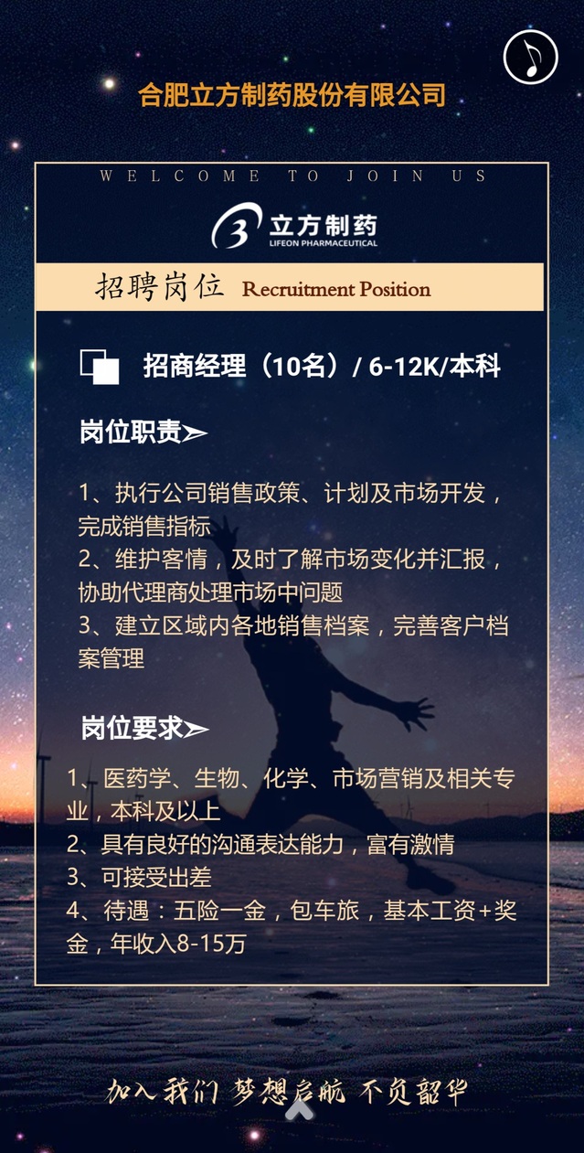 招聘單位:合肥立方制藥股份有限公司