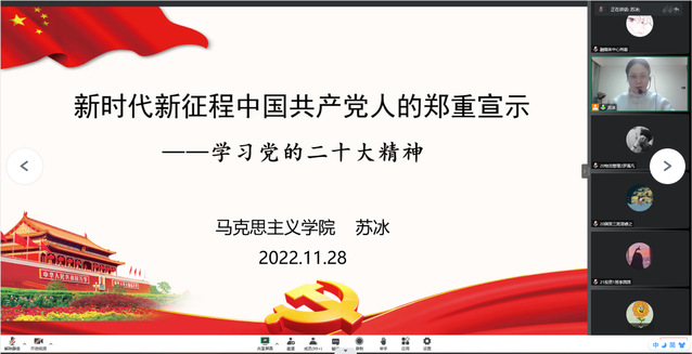 為把學習好、貫徹好、落實好黨的二十大精神作為重要政治任務,積極開展經(jīng)濟與管理學院黨員發(fā)展工作,2022年11月28日,經(jīng)濟與管理學院第期入黨積極分子線上培訓班第二課《新時代新征程中國共產(chǎn)黨人的鄭重宣示——學習黨的二十大精神》順利開講。本次黨課由馬克思主義學院副院長主持工作蘇冰老師主講。
