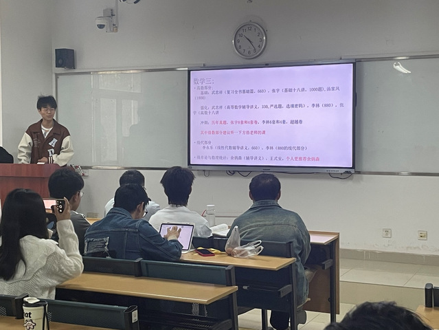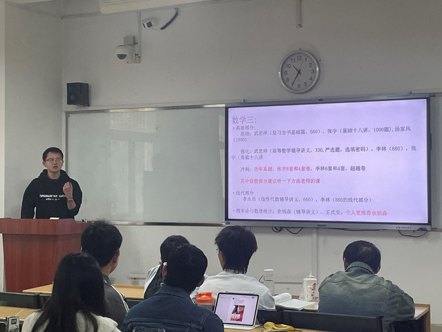 會上,于老師簡要介紹了經管學院20級整體考研及就業情況,深入分析了當下的考研和就業形勢,鼓勵同學們積極進取努力拼搏,虛心接受學長的建議。隨后,張忠兵、唐肖鋒分別為同學們講解了在備考期間應該注意的問題,包括考研各科的復習方法、備考計劃、院校選擇、作息時間安排等,同時建議考研、考公的同學可以在下學期積極參加校園招聘會,在備考的同時可先與意向單位簽約保底,緩解心理壓力。在現場提問環節,張忠兵、唐肖鋒悉心解答了同學們提出的各種問題,并給出了有針對性的參考建議,進一步堅定了在場同學們的備考信心。