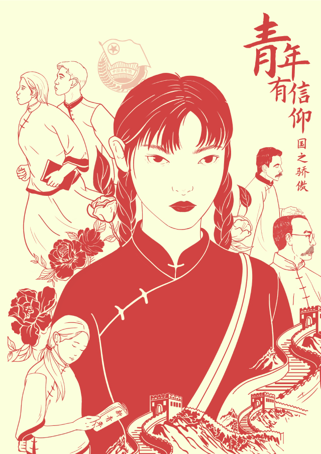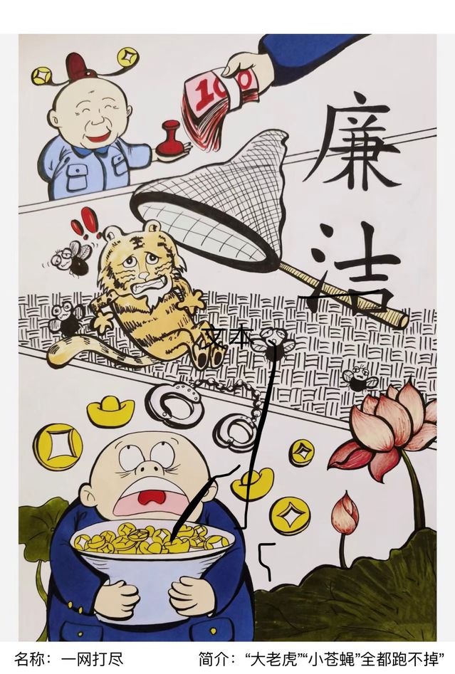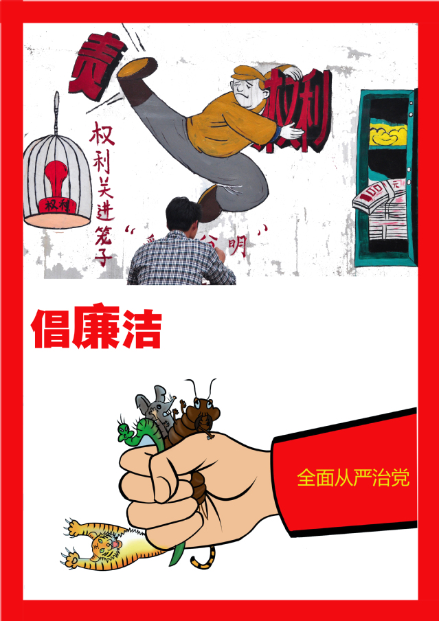 作品圍繞“反腐廉潔”進行創作,運用了三位手工藝人的形象對貪污腐敗的人進行反諷;將腐敗不正之風的人不會有的生活方式直接寫了出來,同時使用扁平畫的風格將生活中最樸素人物的真實的狀態表現出來,字體偏手寫風格,充滿親和力,“廉潔”兩字使用紅色更加突出。