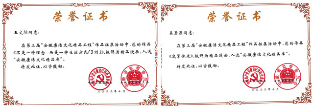 根據(jù)第三屆“安徽廉潔文化精品工程”作品征集展播活動,校紀委第一時間發(fā)布了《關于合肥學院廉潔文化作品征集的通知》,得到了全校師生的積極響應。截至4月10日,共征集廉潔文化作品150余件,校紀委通過擇優(yōu)評選,評出一等獎6個、二等獎8個、三等獎20個、優(yōu)秀組織獎6個,并對獲獎作品在合肥學院紀檢監(jiān)察網(wǎng)進行了線上展播。根據(jù)要求,校紀委擇優(yōu)推選了6件優(yōu)秀作品參加第三屆“安徽廉潔文化精品工程”作品征集展播活動,最終我校設計學院的王文烜、吳景源兩位同學創(chuàng)作的漫畫作品成功入選。