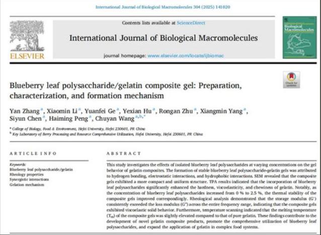 20252月,合肥大學生物食品與環境學院王儲炎教授課題組在International Journal of Biological Macromolecules1TOPIF=7.7)發表了題為“Blueberry leaf polysaccharide/gelatin composite gel: Preparation, characterization, and formation mechanism”的論文。王儲炎教授為通訊作者,碩士研究生張巖為第一作者。