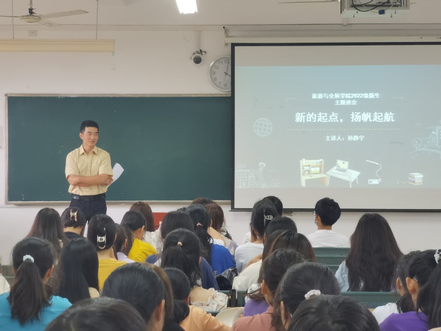 9月9日,為幫助2022級新生盡快熟悉校園環境,融入新的集體,旅游與會展學院于一區博學樓A座303教室和305教室召開2022級新生主題班會,參加本次會議的有旅游與會展學院黨委書記黃雄英,黨委副書記孫靜宇,學工辦副主任董敏,輔導員助理以及2022級的全體新生。