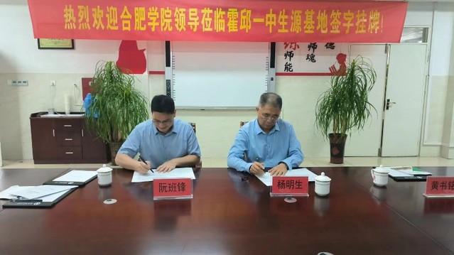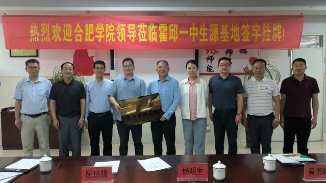 座談會(huì)后,雙方舉行了合肥學(xué)院和毛坦廠中學(xué)東城校區(qū)“優(yōu)質(zhì)生源基地”授牌儀式。在霍邱縣第一中學(xué),黨委書記、校長(zhǎng)楊明生,副校長(zhǎng)王德寶、許正田等校領(lǐng)導(dǎo)首先帶領(lǐng)宣傳小組參觀了霍邱一中校園及周邊環(huán)境。隨后,在霍邱一中名師工作室雙方簽訂了戰(zhàn)略合作協(xié)議,舉行了合肥學(xué)院“優(yōu)質(zhì)生源基地”授牌儀式。在儀式上,楊明生校長(zhǎng)介紹了霍邱一中近年來(lái)的辦學(xué)情況、校園文化建設(shè)和教育教學(xué)改革情況;阮班鋒院長(zhǎng)介紹了合肥學(xué)院的辦校歷史和辦學(xué)特色,陳俊院長(zhǎng)介紹了生物食品與環(huán)境學(xué)院的專業(yè)設(shè)置和學(xué)科特點(diǎn)等情況,希望未來(lái)有更多的霍邱一中優(yōu)秀學(xué)子進(jìn)入合肥學(xué)院深造。雙方都表達(dá)了加強(qiáng)溝通交流與友好合作的意愿。