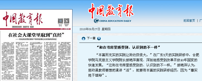 中國教育報2018年9月27日《在社會大課堂里取到“真經”——各地高校思政課骨干教師暑期社會實踐研修綜述》中,記述了胡艷萍的感受:“豐富而充實的實踐讓我收獲很大。”在廣東5天的實踐研修中,合肥學院馬克思主義學院院長胡艷萍直觀、深刻地感受到改革開放40年國家的快速發展。“這和在書房里感受到的、認識到的不一樣。”胡艷萍認為,思政課教師要想把課講“活”,就要有豐富的實踐研修經歷,因為“事實勝于雄辯”。(馬克思主義學院)