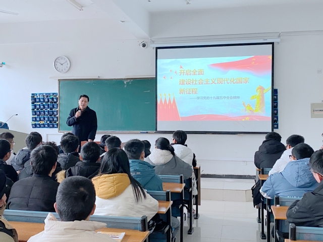 課上,劉建中用翔實的數據資料帶領同學們回顧了我國現代化建設的歷史進程,列舉了黨和國家事業發展取得的歷史性成就。他圍繞深刻認識五中全會召開的重大意義、規劃《建議》的主要看點、2035年遠景目標、“十四五”時期我國經濟社會發展的指導方針、主要目標、重點任務、構建新發展格局的戰略構想、中國共產黨領導的制度優勢等方面深入闡釋和全面解讀了全會精神。他深刻指出,全面落實黨的十九屆五中全會精神,最根本的就是增強“四個意識”、堅定“四個自信”,做到“兩個維護”。他勉勵同學們要自覺肩負起時代發展大任,堅定理想信念,厚植愛國主義情懷,站高望遠,勤奮學習,以真才實學服務人民,以創新創造貢獻國家。