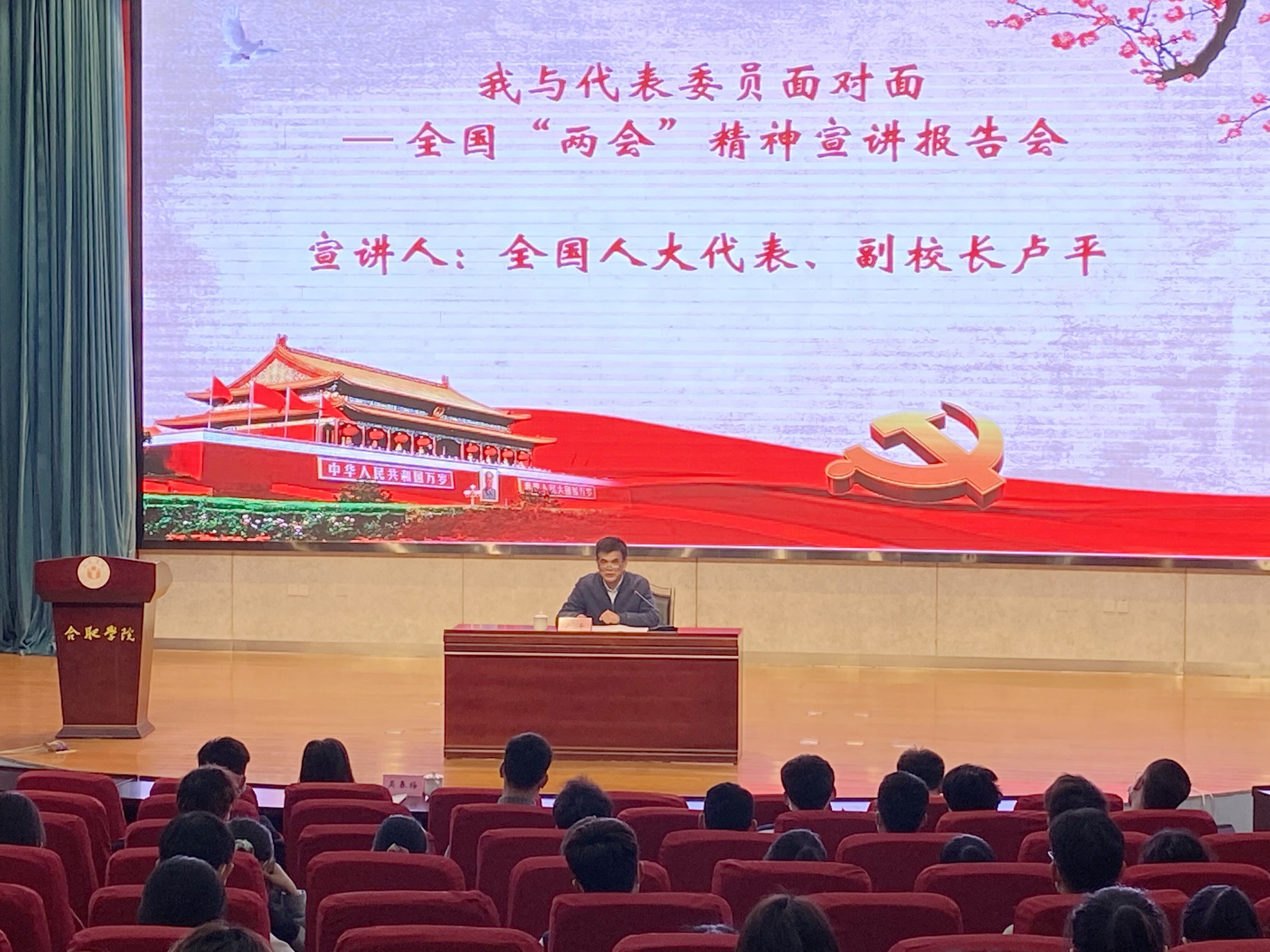 | 3月16日下午,我校在圖書館報告廳A廳舉辦“我與代表委員面對面”——全國“兩會”精神宣講報告會。全國政協(xié)委員、校長吳春梅,全國人大代表、副校長盧平出席會議,各學院學生代表參加會議,報告會由校黨委委員、宣傳統(tǒng)戰(zhàn)部部長賈峰主持。