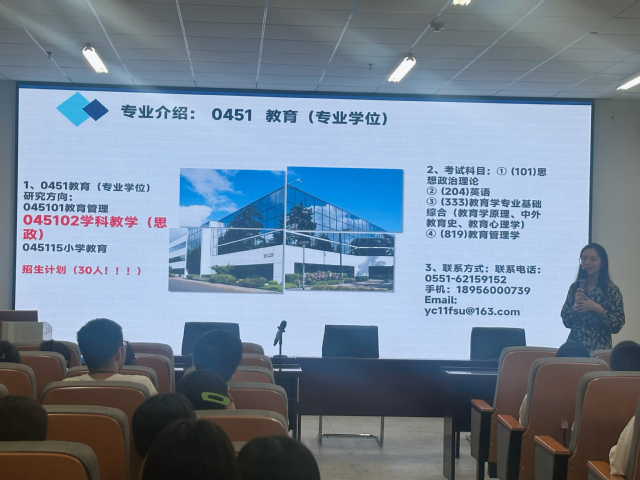 | 2024年馬克思主義學院學科教學(思政)研究生 招生宣講 為進一步擴大學科教學(思政)研究生生源,提升招生質量,拓展我校學科教學(思政)專業第一年招生渠道,馬克思主義學院積極推進2024年學科教學(思政)專業研究生招生宣傳工作。 9月20日下午,王芳主任和葛玉榮博士赴淮南師范學院開展馬克思主義學院學科教學(思政)專業研究生招生宣講工作。淮南師范學院副院長孫自勝主持會議,馬克思主義學院大四年級畢業生80余人參加了宣講會。
