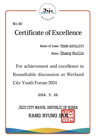 張惠琳作小組匯報 圓桌論壇從教育、文化、市民、政策和技術五個領域進行了熱烈的討論,與會者共同擬草了“倡導濕地可持續發展青年宣言”。張惠琳老師作為“政策”組代表進行小組匯報,內容包括制定政策推進濕地保護相關軟件和技術的開發,加強濕地城市高校之間聯系,推動大學生生態文明理論認知和踐行的具體方法等。報告內容詳實、邏輯清晰,獲得了與會嘉賓一致好評。拉姆薩爾東亞區域中心主任徐承鎬等4名專家一致決定授予“優秀提案獎”,濟州市長姜秉杉為張惠琳授獎。