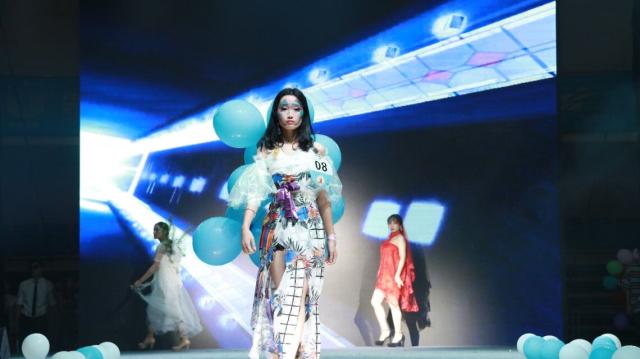 比賽伊始,活動現場播放了來自各大高校的祝福視頻。隨后,13個系的模特代表便依次為觀眾呈現了一場絢麗繽紛的開場秀表演,比賽正式拉開帷幕。第一個上場的機械系模特隊伍,設計師們以綠色為主色調,與當下季節相襯,給人視覺上的清爽,贏得了在場觀眾的歡呼。而外語系則以童話故事為背景,最引人注目的是一位守護著原始部落的自由女神,身著以廢舊光盤為主要原料、通過紙片和舊報紙的分割重組形成一個全新的服裝造型,突出了綠色環保、大膽創新的服裝設計原則,富有跳躍感而又不失沉穩。
