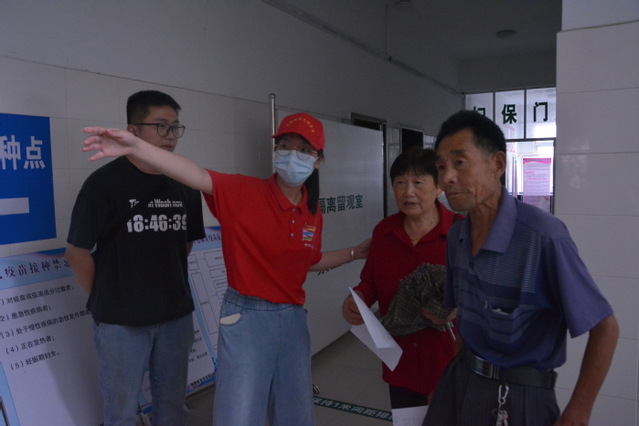 到達柿樹崗鄉之后,調研團隊面對蚊蟲叮咬、天氣炎熱和較為艱苦的住宿環境沒有表現出畏難情緒,而是即刻參與到當地醫療衛生工作之中。大家前往當地衛生院,協助醫護人員完成疫苗接種工作,幫助維護現場秩序,同時也為當地人民普及基礎醫療知識,解答關于疫苗接種問題,消除未接種居民心中的疑惑與擔憂。
