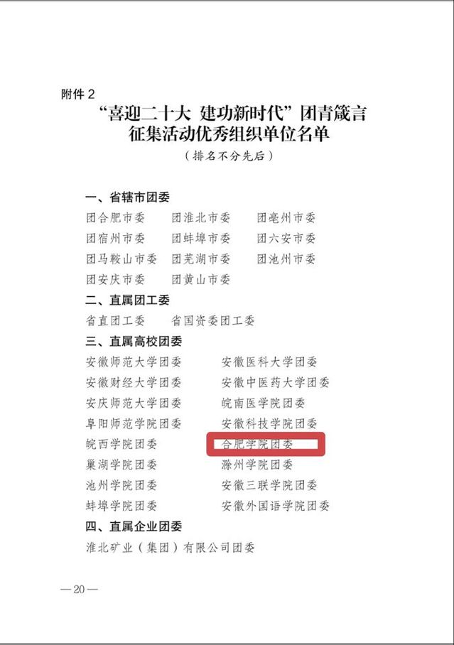 為迎接黨的二十大召開,扎實推進從嚴治團,引領青年奮進新征程,共青團安徽省委舉辦了“喜迎二十大 建功新時代”團青箴言征集活動。我校學生多件作品在評選中獲獎,我校團委榮獲“優秀組織單位”稱號。