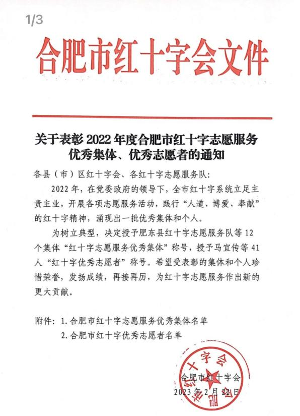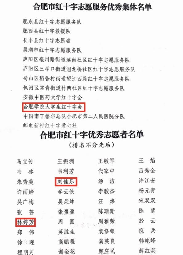 為樹立典型,進一步踐行“人道、博愛、奉獻”的紅十字精神,合肥市紅十字會通報表彰了2022年度合肥市紅十字志愿服務優秀集體優秀志愿者,我校大學生紅十字會榮獲“合肥市紅十字志愿服務優秀集體”稱號我校林婷芳和劉佳樂兩位同學榮獲“合肥市紅十字優秀志愿者”稱號。