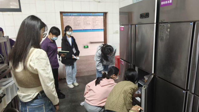 活動中,衛生檢查小組帶領成員對二期食堂展開細致檢查。檢查小組對廚房內部環境是否衛生進行判斷,著重檢查每一區域的原材料的新鮮程度和儲存庫中調味品的生產日期,從而確保食品安全健康,并對此次檢查結果進行評估報告。食堂經理對于同學們的詢問耐心解答,一一做出回應,對于檢查小組反映的在校生就餐時遇到的份量少、食品不新鮮等問題給予高度重視,并承諾將會盡快解決問題。