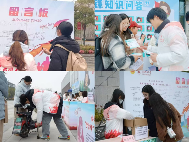 服務(wù)驛站映日輝,點(diǎn)亮春日校園美。校青年志愿者聯(lián)合會(huì)設(shè)置“追尋雷鋒足跡”服務(wù)驛站,志愿者們?yōu)閹熒峁┭坨R清洗、電腦維修、電瓶車打氣、手機(jī)貼膜、證件照拍攝、醫(yī)療護(hù)理、圖書捐贈(zèng)、科普環(huán)保等多項(xiàng)公益服務(wù)。為吸引更多青年學(xué)生參與活動(dòng),青志聯(lián)組織開展“雷鋒知識(shí)問答”盲盒競(jìng)猜和“贈(zèng)人玫瑰,手留余香”留言活動(dòng)。活動(dòng)期間,驛站累計(jì)服務(wù)近千余人。