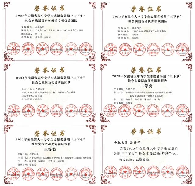 2023年12月,團(tuán)中央、團(tuán)省委分別對(duì)2023年大中專(zhuān)學(xué)生志愿者暑期文化科技衛(wèi)生“三下鄉(xiāng)”社會(huì)實(shí)踐活動(dòng)中表現(xiàn)突出的優(yōu)秀集體、個(gè)人和項(xiàng)目進(jìn)行了表彰。我校喜獲1項(xiàng)國(guó)家級(jí)、7項(xiàng)省級(jí)榮譽(yù),部分證書(shū)于近日發(fā)放。