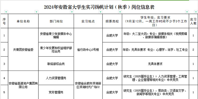 提供此次實習活動崗位的單位:團省委和安徽省高速地產集團有限公司,人數為6人。招募要求見下表。