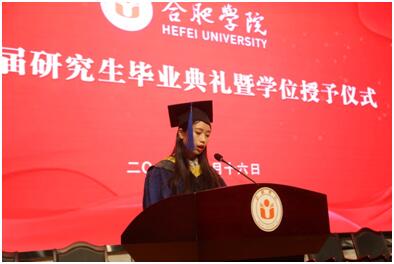 2019屆碩士畢業(yè)生席小倩作為畢業(yè)生代表發(fā)言。她回憶了自己從渴求知識(shí)的青年,成長(zhǎng)為略有所成的畢業(yè)生的履歷過(guò)程, “是母校的老師帶給我們知識(shí),是母校的土地供給我們生活,是母校的精神鼓勵(lì)著我們前行。” 她說(shuō),“飲水思源,結(jié)草銜環(huán)。母校和老師為我們的辛勤付出,我們始終銘記在心。千言萬(wàn)語(yǔ),都不足以表達(dá)出我們的感恩”,并代表全體畢業(yè)生祝愿自己的母校——合肥學(xué)院,積歷史之厚蘊(yùn),展時(shí)代之宏圖,譜瑰麗華章。