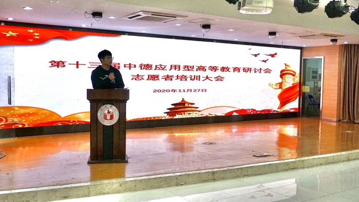 11月27日中午,第十三屆中德應用型高等教育研討會志愿者培訓大會在大學生活動室舉行。校團委杜娟書記、中德應用型高校教師能力發展中心副主任陶龍澤及兩百余名志愿者參會。會議由校青志聯主席汪朋主持。